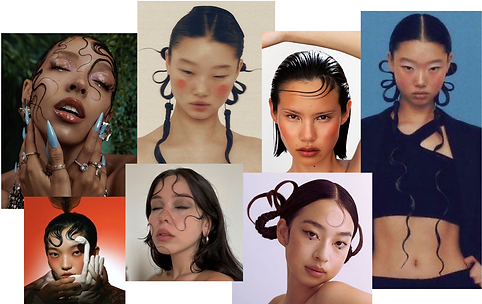 The hair and makeup concept draws inspiration from nature, aiming to create a harmonious and cohesive look that complements each garment. Makeup colors will be carefully matched to each outfit, creating a monochromatic effect that blends seamlessly with the natural environment. The eye makeup will feature organic shapes, emphasizing a camouflage effect to symbolize unity with nature. Cheeks and lips will be kept in muted tones, with highlights focused on the upper part of the face to avoid excessive flashiness. For the hair, an ethereal, otherworldly feel will be achieved by styling it to follow natural curves, softly framing the face and enhancing the overall mystical aesthetic.